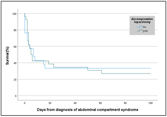 Kaplan–Meier curve with survival rate of patients with abdominal compartment syndrome requiring veno-venous or veno-arterial extracorporeal membrane oxygenation, or extracorporeal cardiopulmonary resuscitation according to decompressive laparotomy. Survival is presented in percentages. Days from diagnosis of abdominal compartment syndrome were assessed retrospectively.