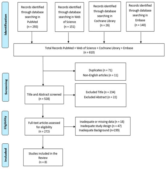In total, 610 articles were identified. After screening, 71 articles were removed due to duplication, and 11 articles were excluded because they were not published in English. This left 528 articles for title and abstract screening. Finally, 18 articles were excluded because of inadequate or missing data, 47 due to inadequate study design, and 199 due to insufficient background, including studies that lacked relevance, theoretical foundation, or connection to the research aim (Figure 1). Eight research articles met the inclusion criteria and were included in this review. These studies are summarized in Table 1.