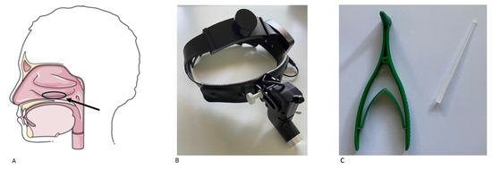 Figure 1. (A): Preferential site for scraping (medial surface of middle third of the lower turbinate). (B,C): A front light cap and sterile curette were used for sampling.