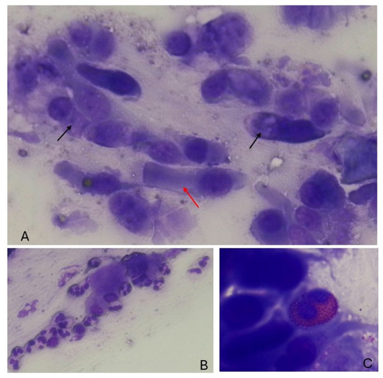 Figure 2. Nasal scraping samples. (A): ciliary cells (red arrow) and mucous cells (black arrow). (B): neutrophils. (C): eosinophil cell.