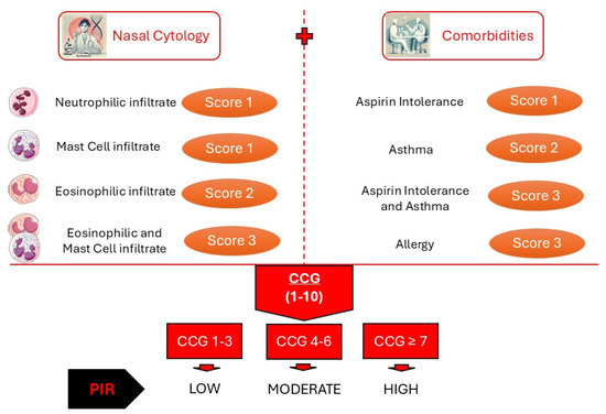 In a large retrospective clinical study conducted on 791 patients with CRSwNP, 50.8% of the patients had AR, 30.8% had concomitant asthma, and 24.8% had aspirin-exacerbated respiratory disease (AERD). Similarly, 11% of the patients had a neutrophilic cytological phenotype, 46.3% had an eosinophilic phenotype, 14.2% had a mastocytic phenotype, and 27.9% had a mixed phenotype. A follow-up analysis of these patients concluded that a high CCG was more frequently associated with asthma, AERD, a history of recurrences requiring functional endoscopic nasal surgery, and the mixed phenotype. In contrast, a low CCG seemed to be associated with the absence of comorbidities, recurrences, and the neutrophilic phenotype [39,40]. In this way, nasal cytological analysis and the presence of specific comorbidities provide the CCG, defining the severity degree of CRSwNP, which is closely related to the PIR, in order to provide personalized treatment [41]. This is an observational study that lays the groundwork for future research protocols aimed at analyzing the effectiveness and accuracy of this score in CRSwNP.