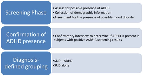 - van Emmerik-van Oortmerssen, K.; van de Glind, G.; van den Brink, W.; Smit, F.; Crunelle, C.L.; Swets, M.; Schoevers, R.A. Prevalence of attention-deficit hyperactivity disorder in substance use disorder patients: A meta-analysis and meta-regression analysis. Drug Alcohol Depend. 2012, 122, 11–19. [Google Scholar] [CrossRef]