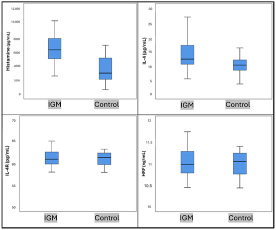 Histamine, IL-4, IL-4R, and HRF values in IGM and control groups. Mann–Whitney U Test.