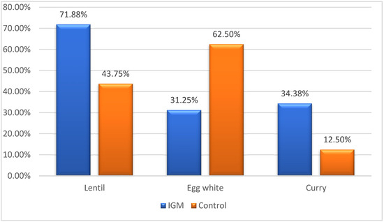 Beyond genetics, environmental factors significantly influence autoimmunity development, with recent years witnessing a surge in autoimmune disease incidence attributed to environmental triggers, particularly food and its components [11]. Based on this point, studies have been conducted to investigate the potential relationship between food intolerance and various diseases. For instance, a study involving rheumatoid arthritis patients revealed symptom regression in 91% of patients subjected to a restricted diet targeting their sensitivities, indicating the potential impact of dietary factors [26]. In a study by Cai et al., specific IgG antibody values against certain foods were identified in patients with Crohn’s disease and ulcerative colitis, suggesting a potential link between food intolerance and the development of these diseases. Egg is the most frequently identified food allergen in these patients [27]. Coucke et al. established a link between autoimmune diseases and food intolerance, identifying reactive food epitopes such as cow’s milk, casein, egg white, and wheat as potential triggers in autoimmune patients [11]. Interestingly, in our study, allergy to egg white was 31.25% in IGM patients compared to 62.5% in the normal cohort.