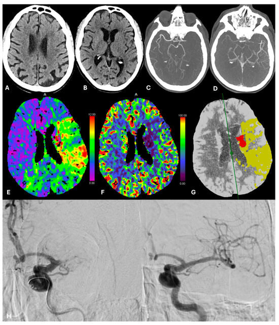 Case Nr. 10. Unenhanced CT shows a small ischemic lesion in the left lentiform nucleus, ASPECT score 9 (A,B). Multiphase angio-CT documents a left M1 occlusion (C) with good collateral circulation in the later acquisition (D), also facilitating estimates of the thrombus length. CT Perfusion: Tmax (E) and CBF (F) maps show a large hypoperfusion area in the left cerebral hemisphere; summary map (G) clearly outlines a small ischemic core (red area) and a large ischemic penumbra (yellow area), based on Tmax > 6s and rCBF < 30% respectively. Left M1 occlusion was confirmed during the diagnostic angiography (H) and treated by thromboaspiration technique, achieving complete recanalization of the middle cerebral artery (I).