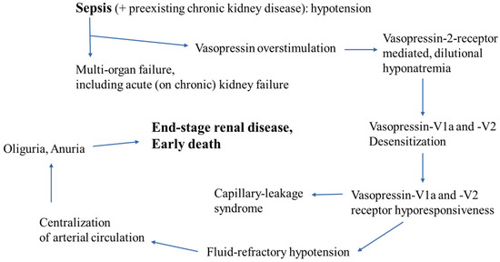 A pre-existing renal insufficiency may limit the capacity of the body to counteract sepsis. In the early stages of sepsis, low blood pressure due to sepsis-associated arteriolar vasodilation is counteracted by tachycardia and increased vasopressin release due to baroreceptor activation, leading to increased renal water reabsorption. As for sepsis-induced hypoalbuminemia, the vascular underfilling aggravates the effect of arterial hypotension during sepsis. In these early stages of sepsis, fluid resuscitation may preserve renal function. In all forms of sepsis, the neurohormonal interplay between the heart and kidney plays an important role in maintaining organ function, adapting organ function to actual needs. Specifically, brain-type natriuretic peptide from the heart stimulates renal water and sodium excretion and serves as a laboratory surrogate value for acute or chronic heart failure. In addition, central-nervous-system and heart sympathoactivation, including catecholamine release from the adrenal glands, and the aforementioned vasopressin are activated during sepsis. As a consequence, dilutional hyponatremia occurs, thus rendering sepsis a common cause for hyponatremia in critically ill patients at hospital admission [31]. However, as shown in Figure 1, vasopressin responsiveness may be poor due to vasopressin receptor desensitization [2,32,33]
