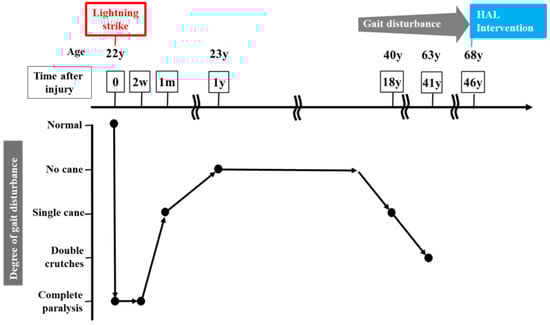 Progression of the patient’s symptoms following the lightning strike injury and the timing of the initiation of hybrid assistive limb gait training.