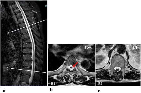 Mid-sagittal section (a) and axial sections at the T5/6 level (b) and L1 level (c) of the T2-weighted magnetic resonance image showed that his thoracic spinal cord was slightly atrophic (arrow in (b)).