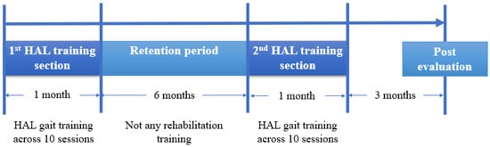 Schematic representation of the hybrid assistive limb (HAL) gait training program used in this study. The program comprised 1 month of gait training using HAL conducted across 10 sessions, ranging between 2 and 3 sessions weekly, a 6-month retention period during which the patient did not undergo any rehabilitation training, another month of HAL training, and an evaluation 3 months after the 2nd HAL training section.