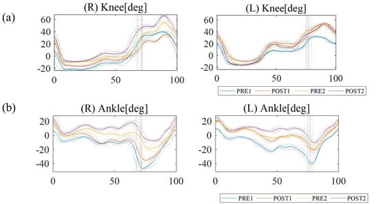 Temporal profile of the angular position of the right and left knee (a) and ankle joints (b) over the gait cycle, measured without the hybrid assistive limb (HAL) before session 1 (PRE) and after session 10 (POST) in the first (PRE1, POST1) and second HAL training sections (PRE2, POST2). Vertical lines indicate the moment of toe lift.