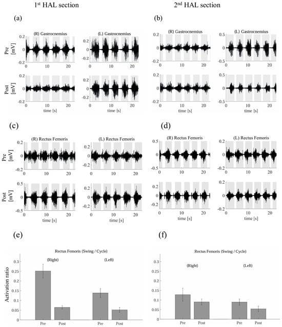 Surface electromyographs of the right and left gastrocnemius for the first (a) and second hybrid assistive limb (HAL) sections (b), pre and post-assessment and the right and left rectus femoris for the first (c) and second HAL sections (d). Gray bars indicate the stance phase. Also shown is the ratio of muscular activities during the swing phase pre- and post-assessment in the first (e) and second HAL sections (f).