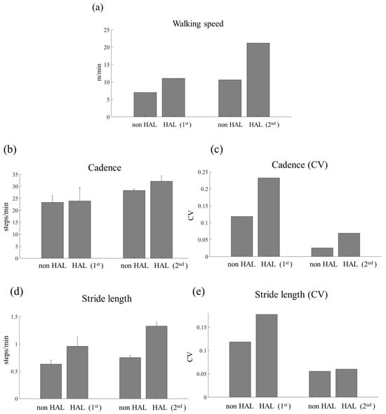 The walking parameter results, including stride length, cadence, and toe lift height, were higher with HAL than those without HAL. Furthermore, in the second section, the differences in these parameters between the conditions with HAL and without HAL became more distinct. Regarding the CV, the variability in stride length and cadence decreased in the second section compared to that in the first section. However, in the second section, toe lift height with HAL decreased compared to that without HAL.