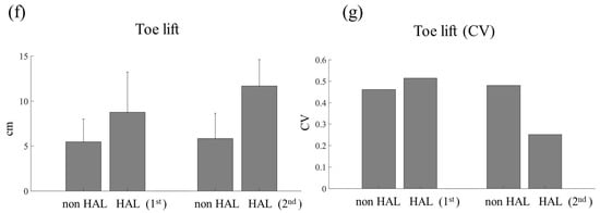 The walking performance with and without HAL during the fifth session of the first and second sections and the walking speed are shown in Figure 9a. Additionally, variability in stride length, cadence, toe lift height, and their CV between walking with and without HAL are illustrated in Figure 9b–g. The results indicated that, in both the first and second sections, the walking speed with HAL was higher than that without HAL. Notably, the gait speed with HAL in the first section was comparable to that without HAL in the second section. Furthermore, in the second section, the difference in walking speed between conditions with HAL and without HAL was more pronounced.