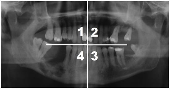 The observation scheme included an initial and two follow-up examinations performed at 5–6 month intervals. During the initial examination, gender, age, MRONJ severity, duration of MRONJ, and location of lesions were determined. The underlying disease, an indication to apply antiresorptive drugs, was identified, and history regarding systemic comorbidities and treatment was collected. Cell Blood Count (CBC) was performed in all participants, and C-reactive protein (CRP) levels were determined. The oral cavity was divided into four quadrants for data analysis: 1—right maxillary, 2—left maxillary, 3—left mandibular, and 4—right mandibular (Figure 1).