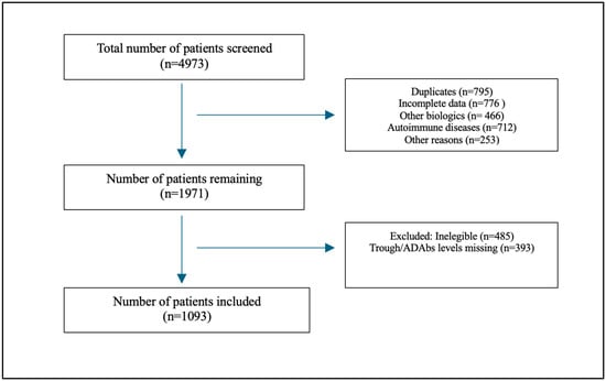 Collected samples of ADAb and serum drug concentration were measured at one central immunology laboratory. To determine drug tolerance, a homogeneous mobility shift assay (HMSA, Prometheus Laboratories Inc., San Diego, CA, USA) was used for all study participants. The assays were performed by incubating the TNF-488/IC with serum samples or calibration standards to reach equilibrium. As in the ATI-HMSA method, the reaction mixtures were then filtered and analyzed by the SE-HPLC system. Serum drug concentrations/ADAb levels were collected only before the next scheduled dose, i.e., at trough levels. Trough serum drug and ADAb concentrations were performed either reactively, or proactively to optimize the therapy as per each physician’s clinical judgment and practice.