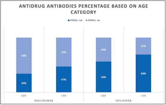 A total of 461 (42.2%) patients were taking infliximab and 632 (57.8%) patients were taking adalimumab. The number of patients receiving combination therapy was 359. Additionally, 147 (40.9%) were prescribed infliximab combination therapy and 212 (59.1%) were prescribed adalimumab combination therapy. The median infliximab therapy duration in years was 4.2 (4.0–4.2), whereas the median adalimumab therapy duration in years was 4.6 (4.0–4.6). The geometric mean (95% CI) of the infliximab serum concentration was 3.3 (2.7–4.1) and the geometric mean (95% CI) of the adalimumab serum concentration was 8.4 µg/mL (7.4–9.5). With regard to antidrug antibodies (ADAbs), the geometric mean (95% CI) of anti-infliximab drug antibody serum levels was 29.0 AU/mL (24.9–33.8), while the geometric mean (95% CI) of anti-adalimumab antibody serum levels was 12.2 AU/mL (10.9–13.7). In patients receiving infliximab, 221 patients (48%) had serum levels of >5 µg/mL, while 277 (60%) had detectable ADAbs. In patients receiving adalimumab, 450 patients (71%) had a serum level of >7.5 µg/mL and 251 (39.9%) had detectable ADAbs. Based on the age category, 175 (56%) patients aged ≤30 and 102 (69%) patients aged >30 had positive infliximab ADAbs. In patients receiving adalimumab, 119 (34%) patients aged ≤30 and 132 (47%) patients aged >30 had positive ADAbs (Figure 2).