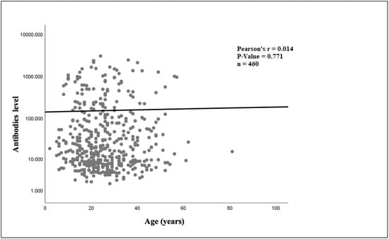 The linear regression analysis showed that in the infliximab cohort (Figure 3), there was a statistically significant relationship between older age and increasing ADAbs levels (p = 0.036). In the adalimumab cohort (Figure 4), there was no statistically significant association between older age and ADAbs levels (p = 0.771).