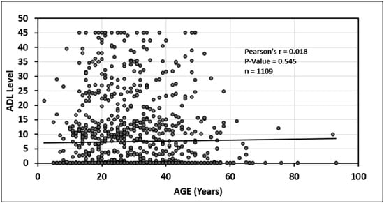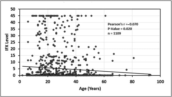 In addition, there was a statistically significant relationship between older age and decreasing infliximab serum trough levels (p = 0.020) see Figure 5. Finally, there was no statistically significant association between age and adalimumab serum trough level (p = 0.54); see Figure 6.