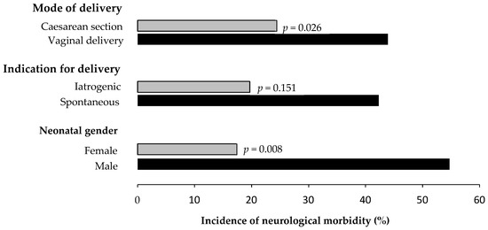 Incidence of neurological morbidity stratified by mode of delivery, indication for delivery and neonatal gender.