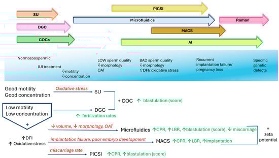 - Sadeghi, M.; Bakhtiari, M.; Ghasemi, M. Advanced sperm selection techniques: An overview and impact on ART outcomes. J. Assist. Reprod. Genet. 2021, 38, 617–626. [Google Scholar]
