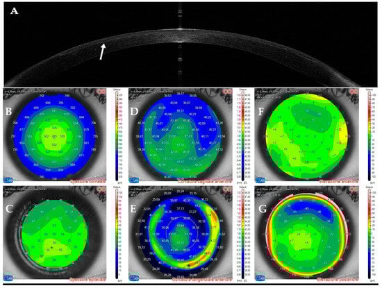 Anterior segment optical coherence tomography and topography sections (AS–OCT) 1 day after laser in situ keratomileusis (LASIK) surgery for myopia correction in a healthy patient. (A): AS–OCT tomography showing a regular corneal flap with a hyperdense regular line (arrow) demarcating the surgical interface. (B,C): Corneal and epithelial thickness. (D,E): sagittal and tangential anterior curvatures. (F,G): Anterior and posterior elevation.