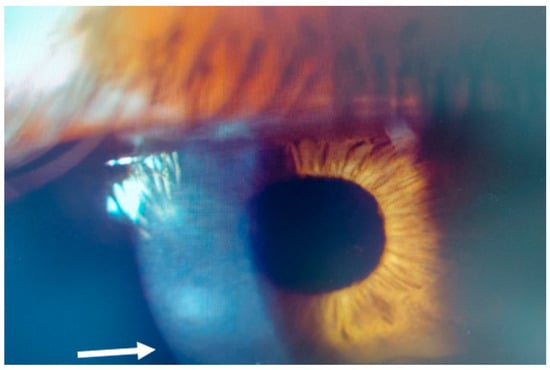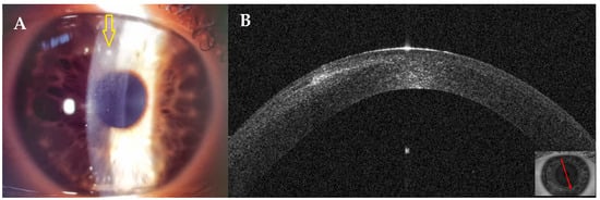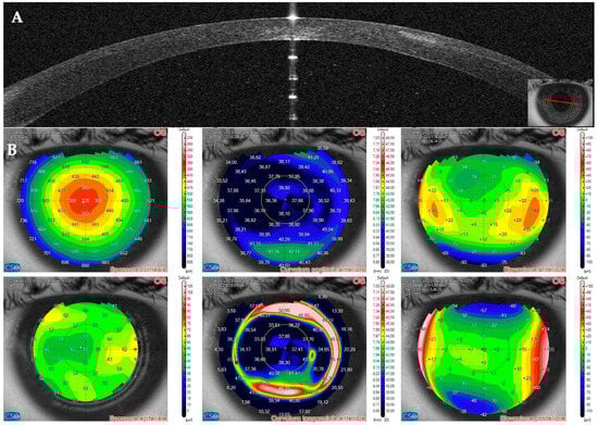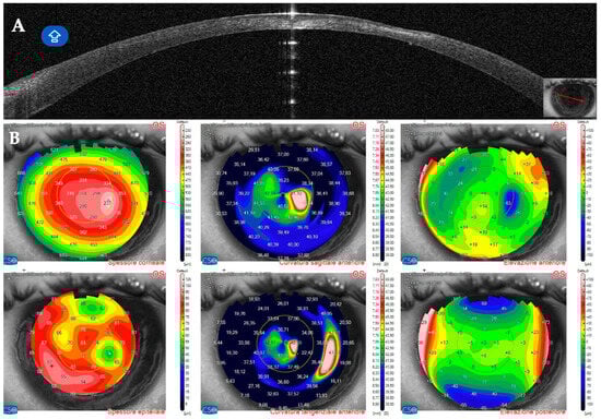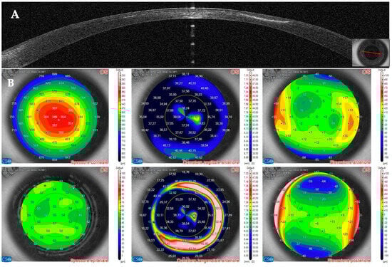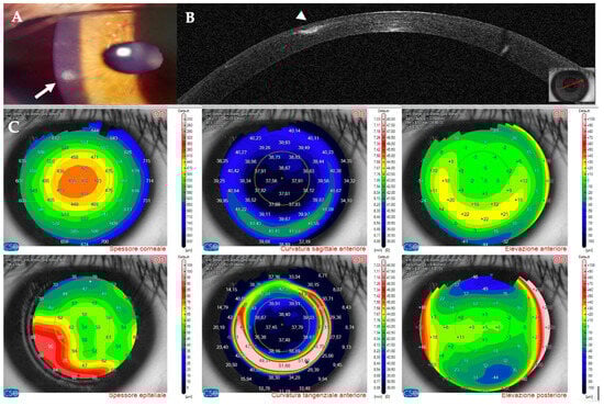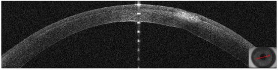 On AS–OCT sections and tomography, a generalized corneal thinning was evident, more pronounced in the lesion area, locally thick at only 237 µm (Table 1), with global epithelial oedema sparing the lesion area (Figure 16A,B). Topical corticosteroids (hydrocortisone 0.335% eye drops) were started to control the inflammatory burden.