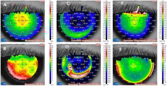 Patient #1 anterior segment optical coherence tomography (AS–OCT) corneal infiltrate three days after LASIK. (A): corneal thickness, modified by LASIK treatment. (B): epithelial thickness, showing epithelial oedema surrounding the infiltrate. (C,D): anterior tangential curvature, evidencing a locally increased curvature corresponding to the infiltrate. (E,F): posterior tangential curvature and posterior elevation modified after LASIK treatment.