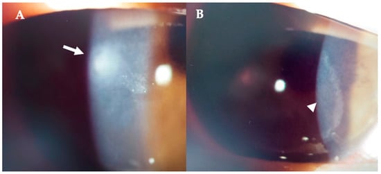 Patient #1 right eye slit–lamp image. Corneal infiltrate five days after LASIK. (A): Corneal infiltrate after three days of topical antibiotics (arrow). (B): ring–shaped pseudo–infiltrate (arrowhead) surrounding an area of corneal oedema (arrowhead).