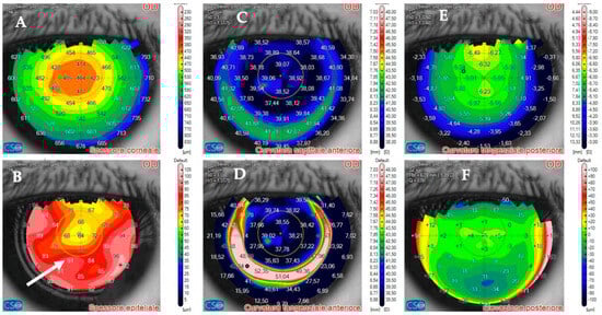 Patient #1 anterior segment optical coherence tomography (AS–OCT) of the right eye corneal infection 12 days after LASIK at AS–OCT tomography. The overall corneal thickness has decreased by 30 µm (A). The epithelium has instead thickened as a compensatory response to the infection (arrow, (B)). The corneal anterior curvature has returned to almost complete regularity (C,D). Corneal posterior tangential curvature and posterior elevation have recovered. The images show normal post–LASIK appearance of the maps (E,F).