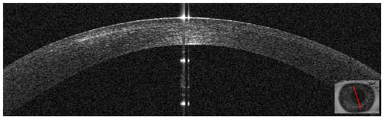 Patient #2 right anterior segment optical coherence tomography (AS–OCT) section. The image shows the resolution of the interface infiltrate 3 days after antibiotic treatment was started.