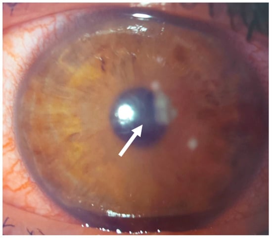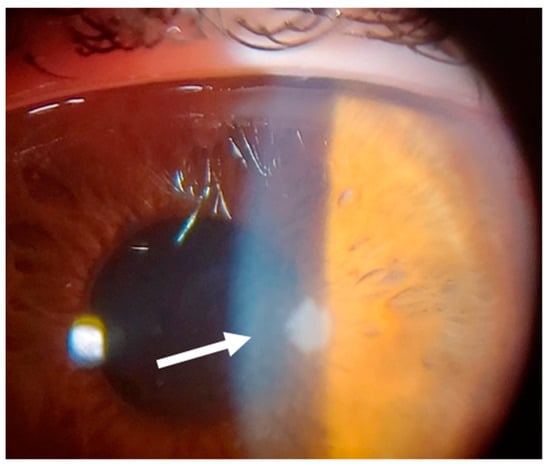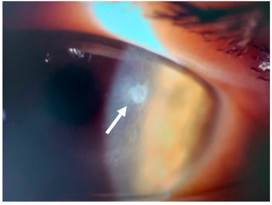 Patient #3 left eye slit–lamp image. Left eye corneal infiltrate (arrow) 31 days after keratorefractive lenticule extraction (KLEx).