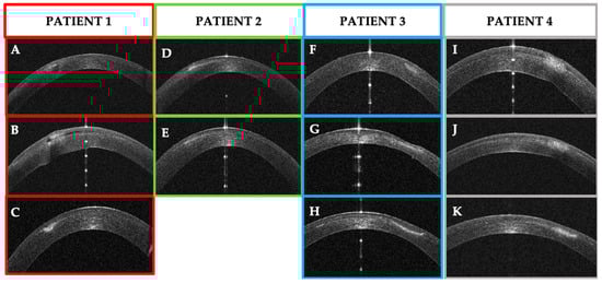 Patients’ corneal changes on anterior segment optical coherence tomography (AS–OCT) before and after treatment. (A–C): Patient #1 AS–OCT images of the corneal infection at baseline (A), day 5th (B) and day 30th after treatment. D–E: Patient #2 AS–OCT images of corneal infiltrate at baseline (D) and at day 20th (E). F–G–H: Patient #3 AS–OCT images of corneal infection at baseline (F), day 7th (G), and after resolution at day 56th (H). (I–K): Patient #4 AS–OCT images of corneal infection at baseline (I), day 3rd (J), and day 10th.