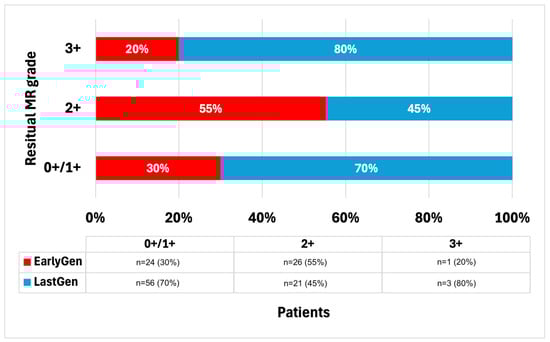 Overall, 49 patients required the implantation of more than one device, with no differences between the early and last generations (n = 18 [36%] vs. n = 31 [38.3%], p = 0.628). In the last-generation group, the majority (n = 74 [91.4%]) received at least an XTR/XTW device, while seven patients (8.6%) received only an NTR/NTW device. A summary of the residual post-procedural MR degrees is presented in Figure 1. Overall, the procedural success rate was 97% (127 out of 131 procedures). Specifically, a residual trivial MR (grade 0+/1+) was observed in 61% (n = 80) of the patients, significantly higher in the Last-Gen device group (24 [47%] vs. 56 [70%], p = 0.009). No differences were observed in terms of residual MR grade ≤2+ between the two groups (50 vs. 77 patients, p = 0.562), or in the residual moderate-to-severe MR (grade 3+/4+; n = 1 vs. 3, p = 0.423). The post-procedure MV gradients were significantly lower in the Last-Gen device group (3.92 ± 2.19 mmHg vs. 2.78 ± 1.29 mmHg, p < 0.001).