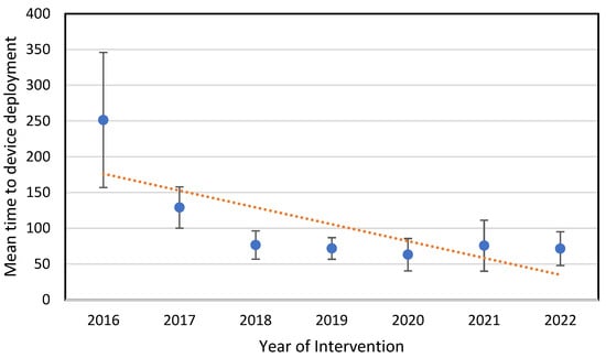 A statistically significant reduction in the time to device deployment was observed in the Last-Gen device group (135.3 ± 6.1 min vs. 72 ± 5.2 min; p < 0.001). Moreover, the time to device deployment tended to shorten year by year (see Figure 2).