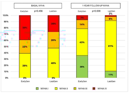 Through 1 year of follow-up, the death rates were similar between the two groups (10 vs. 18, p = 0.836), as were the 1-year hospitalization rates (16 vs. 15, p = 0.190). In the surviving patients, no significant changes in the degree of residual MR were observed in either device group (mean residual MR degree: 1.1 ± 0.5 vs. 1.03 ± 0.7, p = 0.676), with consistent results compared to the post-operative evaluation. A better 1-year NYHA functional class was observed in the Last-Gen device group (p = 0.009; see Figure 3).