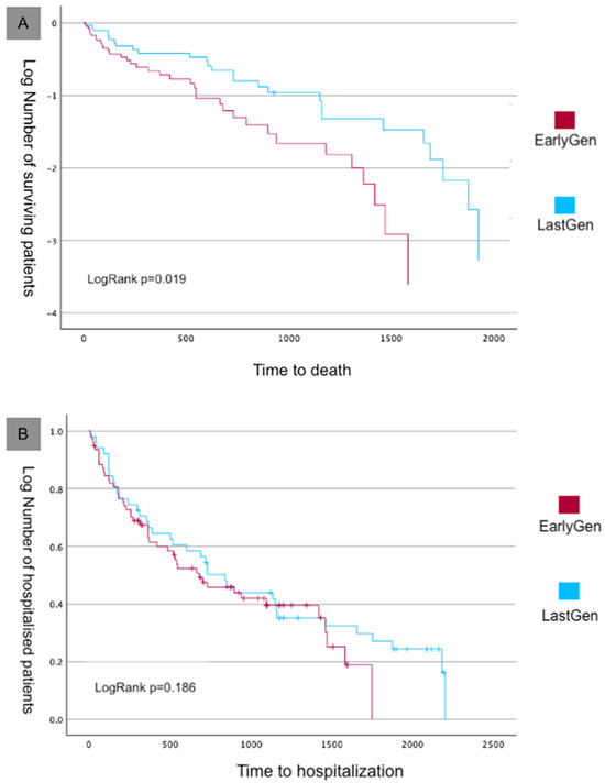 During the long-term follow-up (5.1 ± 1.2 years), the rate of mortality continued to increase in both groups. Overall, at the end of follow-up, 67 deaths from all causes occurred (51.1% of the entire population): 30 deaths in the Early-Gen device group and 37 deaths in the Last-Gen device group (58.9% vs. 45.7% of the initial group size, respectively). According to the Kaplan–Meier analysis, the survival curves were better in the Last-Gen device group (Figure 4A; Log Rank p = 0.019). The total number of worsening heart failure events was 95, with 50 in the Early-Gen group and 45 in the Last-Gen device group (p = 0.21), with no differences in the Kaplan–Meier curves (Figure 4B; Log Rank p = 0.186).