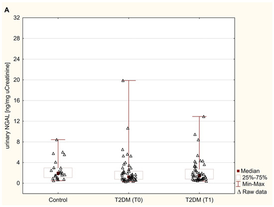 The statistical analyses were performed using the Statistica 13.3 software (TIBCO Software Inc., Palo Alto, CA, USA). The normality of distribution of continuous variables was tested by the Shapiro–Wilk test. Continuous variables with normal distribution were presented as mean ± standard deviation (SD); non-normal variables were reported as median and interquartile (25th–75th percentile) range. The assumption of the homogeneity of variances was tested using Levene’s test. Comparisons between parameters in patients with T2DM and controls were performed using Student’s t-test or the Mann–Whitney U test. Student’s t-test or the Wilcoxon signed rank test were used to assess changes in parameters within paired samples of each T2DM patient. The percentage changes in urinary NGAL, FN, and LN from before to after metformin therapy were calculated. Spearman’s test was used for correlation analysis. Multiple regression analysis of the data was also performed. A p-value was considered significant if it was <0.05. In addition, the details for the statistical analyses of each result are presented in the corresponding table or figure legends.