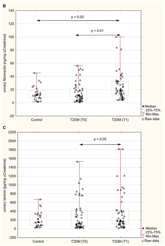 However, despite numerous studies, the potential usefulness of urinary excretion of fibronectin and laminin as biomarkers of diabetic renal injury remains unclear. Thus, the main objective of the present study was to quantitatively evaluate NGAL as an early predictor of acute kidney injury and to assess the levels of two non-collagenous matrix glycoproteins—fibronectin and laminin—in the urine of obese patients with T2DM following anti-diabetic therapy with metformin.