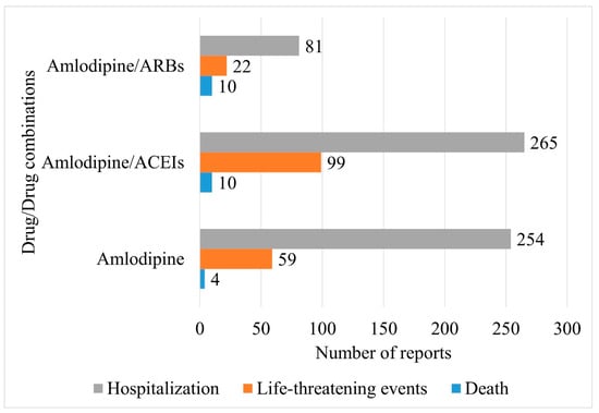 The combination of amlodipine with renin–angiotensin–aldosterone system inhibitors (RAAS-i), particularly ACEIs, has demonstrated superior therapeutic outcomes compared to amlodipine monotherapy, including enhanced blood pressure control, reduced adverse events, and improved tolerability []. Recent clinical evidence further supports this synergistic approach, showing that amlodipine–ACEI combinations provide superior cardioprotection. This is evidenced by reduced incidence of cardiovascular mortality, myocardial infarction, stroke, angina-related hospitalizations, post-sudden cardiac death resuscitations, and coronary revascularization procedures, regardless of prior antihypertensive therapy []. Further, fixed dose combinations of amlodipine and valsartan (ARB) have been approved based on the evidence of superior antihypertensive efficacy compared to monotherapies []. Concomitant use of drugs poises instances for their effects to be modified, which can primarily be attributed to pharmacokinetic/pharmacodynamic alterations. The proportion of adverse events that can primarily be attributed to drug–drug interactions is around 30% []. In the pre-marketing period of the lifecycle of drugs, due to stringent eligibility criteria, patients receiving or required to receive multiple drugs are usually excluded. Further, the pre-marketing studies are also limited to excluding patients with multiple diseases as well as being associated with shorter durations. However, post-marketing, due to necessity, physicians may start using a combination of drugs for which there is a paucity of information available from the prior studies, due to which studies focusing on drug interactions are necessary for understanding the extent and impact of such drug interactions. While ACEIs are well-documented as the leading drug class associated with angioedema [], with a recent study signaling a similar risk with ARBs [], the potential risk of angioedema with concurrent ACEI/ARB and amlodipine therapy remains largely unexplored.