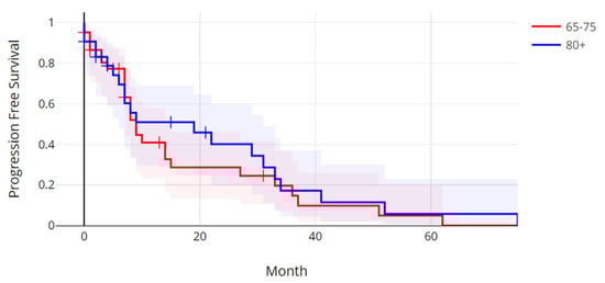 Progression-free survival of patients with metastatic colorectal cancer over 80 years old versus patients 65 to 75 years old. Log Rank p = 0.59.