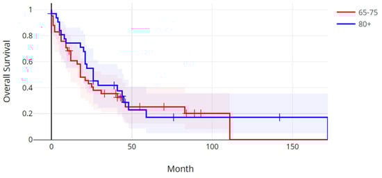 The median progression-free survival in the older age group was 5.58 months (range: 0.3–75.7 months), and the median progression-free survival in the younger age group was 7.47 months (0.3–62.9 months). There was not a statistically significant difference in progression-free survival between the two age groups (Log Rank test p = 0.59) (Figure 1). The median overall survival (OS) in the older group was 26.3 months (range: 0.7–172.5 months), and the median OS in the younger age group was 18.8 months (range: 0.4–111.4 months). The overall survival between the two age groups was also not significantly different (Log Rank test p = 0.52) (Figure 2).