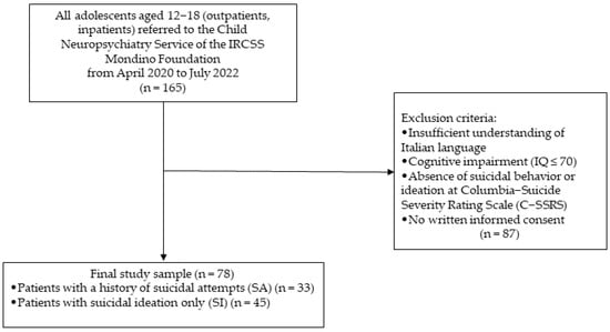 The study enrolled 165 help-seeking male and female patients aged 12 to 18 years who were either outpatients or inpatients at the Child Neurology and Psychiatry Unit of the National Neurological Institute IRCSS Mondino Foundation in Pavia, Italy, between May 2020 and October 2022. A total of 87 patients were excluded based on the following criteria: intellectual disability (IQ ≤ 70), insufficient comprehension of the Italian language by the patients or their caregivers, absence of SI or SA, and lack of consent to participate in the study. The final study population is illustrated in Figure 1.