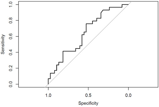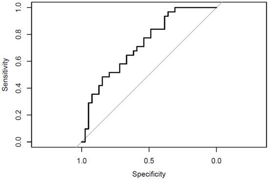 The Mann–Whitney U test revealed a statistically significant difference in depression levels between the two groups (U = 404.00, p = 0.003; Adj p = 0.015). Specifically, the SA group exhibited higher levels of depression (MSA = 23.97, SD = 9.69; min 0, max 35; M rank = 49.97) compared to the SI group (MSI = 16.07, SD = 11.12; min 0, max 37; M rank = 31.68). The area under the curve (AUC) for the BDI-SF was 0.706, indicating good accuracy (Figure 2).