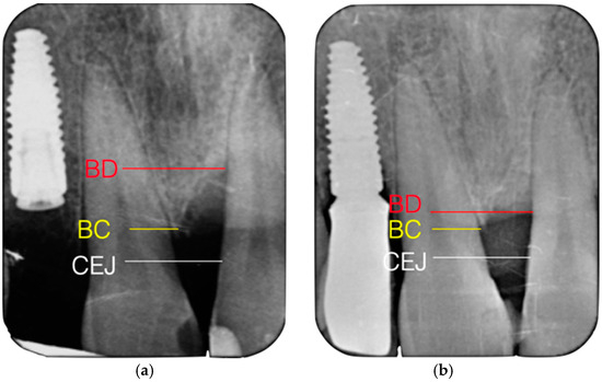 Regarding intrasurgical measurements, the number of remaining bone walls and the infraosseous component of the defect were analyzed. We classified the infraosseous defects based on the number of residual bone walls, according to the system established [33]. In this study, only three-walled or combined defects were recorded. In addition, intrasurgical clinical measures were taken to define the infraosseous component of each defect: (1) distance from the amelocementary junction (CEJ) to the bottom of the defect (CEJ-BD); and (2) distance from the CEJ to the most coronal extension of the interproximal bony crest (CEJ-BC). The infraosseous component of the defect (INTRA) was defined as INTRA= (CEJ-BD) − (CEJ-BC) (Figure 1) [34].