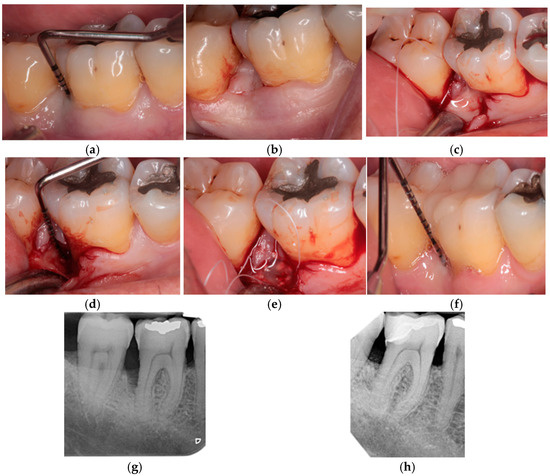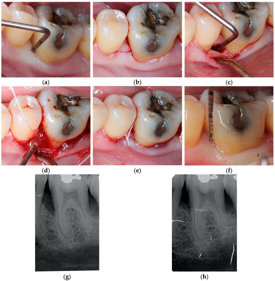 Case from group 2; defect treated with EMD + xenograft. (a) Preoperative probing depth, (b) M-MIST incision, (c) EDTA application, (d) intraosseous component defect, (e) EMDOGAIN and xenograft application (f) postoperative probing depth, (g) preoperative radiograph, (h) postoperative radiograph at 1 year.