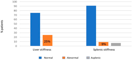 In 12 patients out of 60 (20%) an advanced stage of FALD was found, according to the criteria of Chemello et al. [13]. Fibroscan was performed on all patients. Liver stiffness was higher than the established cut-off value of 22 kPa in 17 patients (25%), with a mean value of 19 ± 9 kPa. For splenic stiffness, given the absence of a reference value for the Fontan population, a cutoff value of 46 kPa (derived from patients with non-FALD chronic liver disease) was established, revealing pathology in six out of sixty-five patients (9%) (Figure 1).