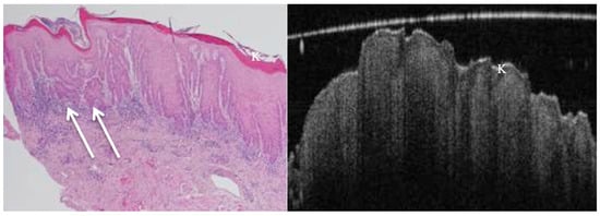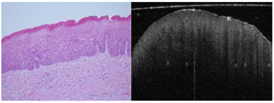 In vivo OCT and histopathology images of a white patch on the posterior lateral tongue reveal keratosis and mild to moderate epithelial dysplasia. K = keratosis.