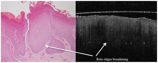 Several research works have used OCT as a method for distinguishing dysplastic or malignant tissue from normal oral mucosa. Epithelial thickening, architectural disorganization, and a loss of basement membrane integrity characterize the status of dysplasia or carcinoma in a suspicious lesion and are observable in OCT images. Reflective patterns in the epithelium and subepithelial stroma further categorize the grades of the dysplasias [10]. Despite such advances, difficulties still persist in the field of standardization of the interpretation of OCT and enabling its use in the routine flow of clinics.