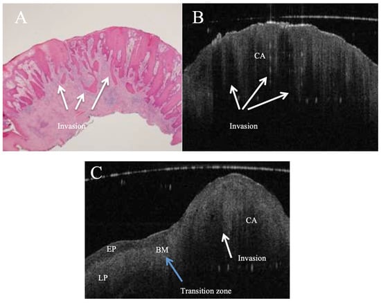 In vivo OCT and histopathology images (A,B) of an erythro–leukoplakic lesion of the soft palate revealing multifocal carcinoma (CA). The OCT image matches the histopathology in displaying multifocal epithelial downwards growth and invasion into the subepithelial layers (white arrows). Furthermore, the basement membrane is indiscernible through the entire OCT scan as a coherent prominent landmark. The bottom image (C) is an in vivo OCT image of a transition zone (blue arrow) between the healthy tissue and invasive carcinoma (CA) invading through the basement membrane. It also shows the normal thickness of the stratified squamous epithelium, which is darker compared to the homogeneous lamina propria; while crossing the transition zone, epithelial downgrowth and invasion can be clearly recognised, and the lamina propria becomes non-homogeneous. BM = basement membrane; EP = epithelium; LP = lamina propria; CA = invasive carcinoma.