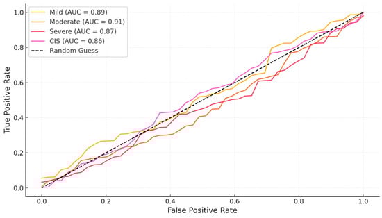 In Figure 5, the ROC curve of the OCT diagnostic capability for each dysplasia grade is shown. Figure 5 presents the AUC, confirming the high discriminatory power of OCT, in particular for moderate dysplasia. The steep rise in the ROC curve towards the upper left corner illustrates the accuracy in the separation of true positives from false positives that OCT provides across all lesion grades. It should be noted, however, that the main separation of the curves with regard to different grades emphasizes the capabilities of OCT to differentiate dysplasias of differing severities; minimal overlap occurred between moderate and mild dysplasia.